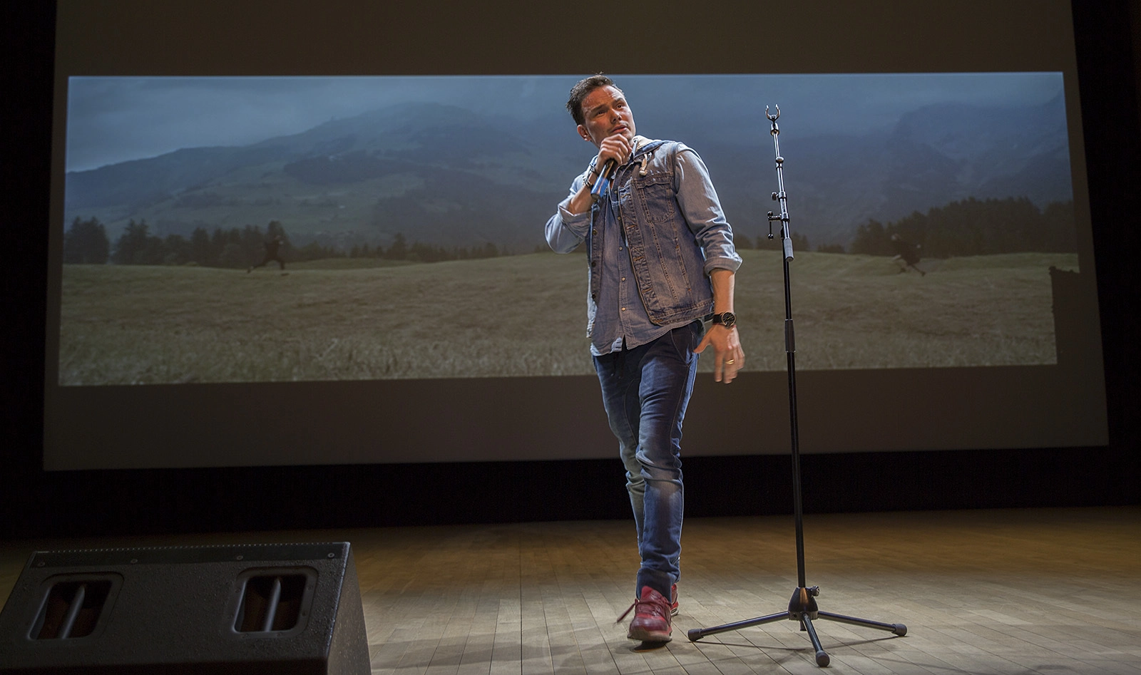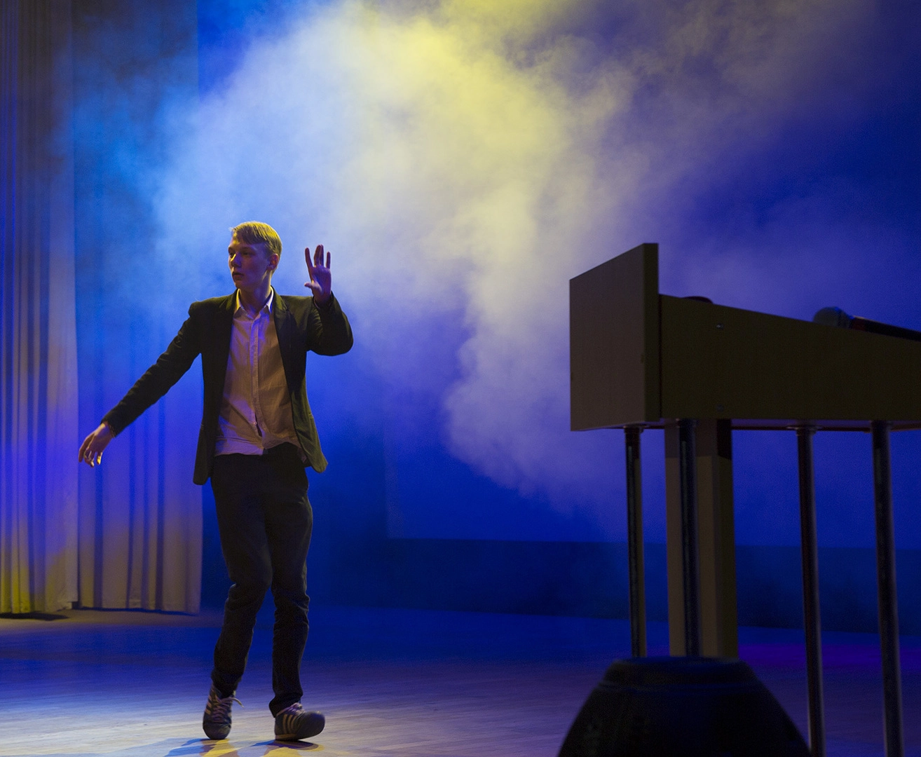 Так сцена смотрится только на этом кадре. Зрители парня не видели, он был в полной темноте. А у меня - вспышка! :)