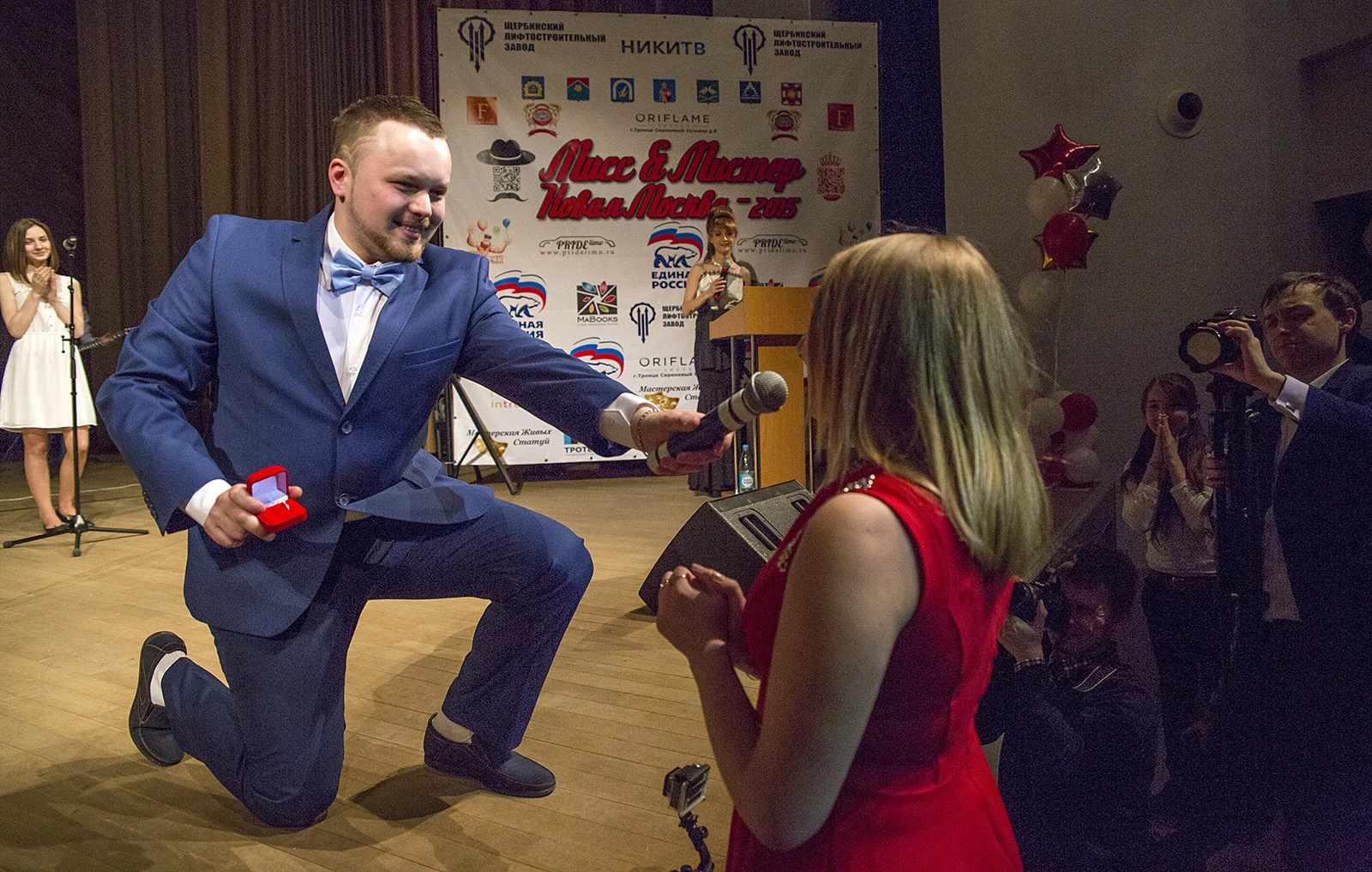 А дальше был полный улёт! На глазах у ведущей, конкурсантов и полного зрительного зала вытащил из кармана красную коробочку. В кадре хорошо видно прожигающие завистливые глаза женского пола.