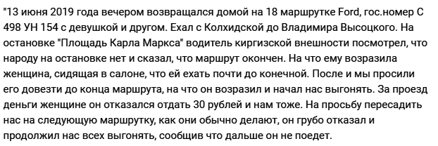 «На просьбу пересадить нас на следующую маршрутку, как они обычно делают, он грубо отказал и продолжил нас всех выгонять, сообщив, что дальше он не поедет», — сообщил в паблике «Инцидент Новосибирск» пострадавший.