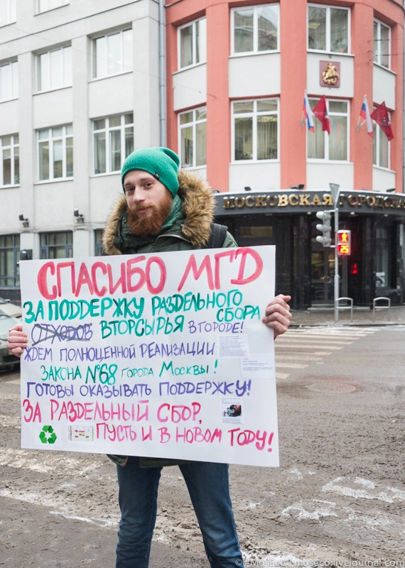 Активист вышел к зданию МГД с плакатом, на котором были написаны слова благодарности и желание оказывать поддержку депутатским инициативам в отношении популяризации раздельного сбора мусора для последующей утилизации и переработки.
