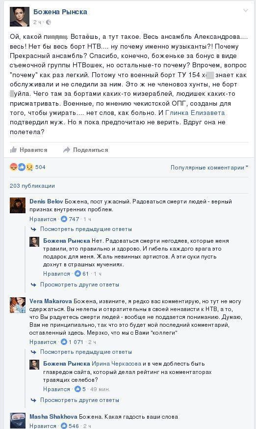 «Встаешь, а тут такое. Весь ансамбль Александрова… весь! Нет бы весь борт НТВ… ну почему именно музыканты?! Почему Прекрасный ансамбль? Спасибо, конечно, боженьке за бонус в виде съемочной группы НТВошек, но остальные-то почему? Впрочем, вопрос „почему“ как раз легкий. Потому что военный борт ТУ 154 х** знает как обслуживали и не следили за ним», — написала Рынска в своем Facebook.
