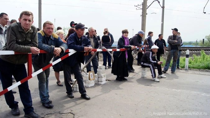 Жители Славянска заблокировали проезд украинским карательным силам. Локомотивом на переезде Андреевка.