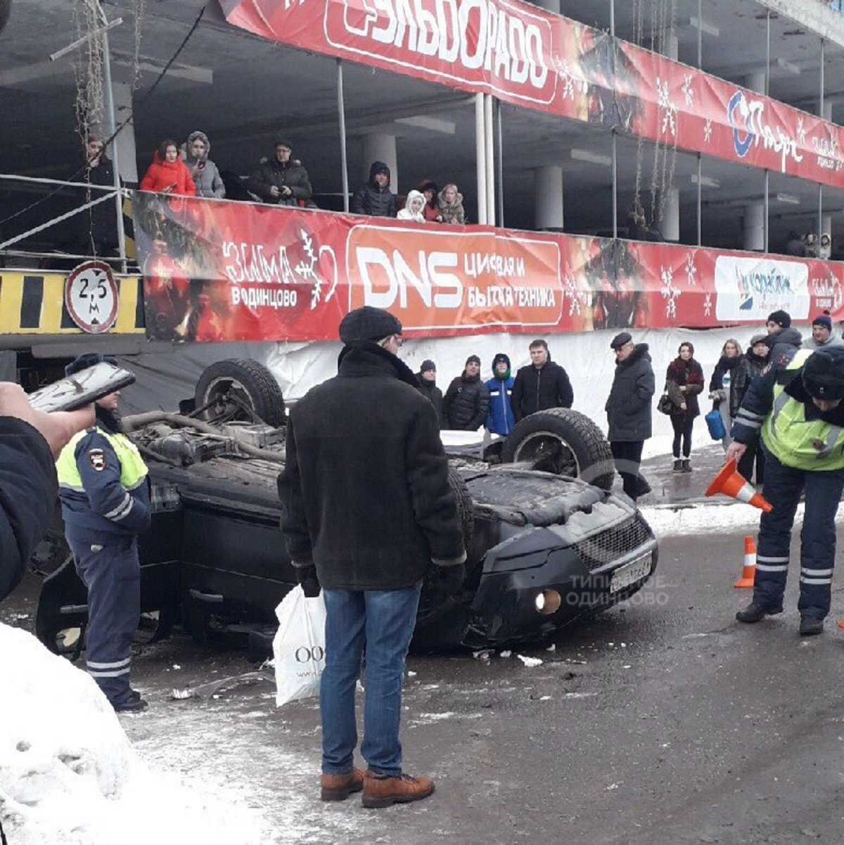 На видеозаписи, опубликованной одним из очевидцев инцидента, автомобиль темного цвета лежит на крыше близ многоуровневого паркинга. Случайные прохожие пытаются оказать первую помощь заблокированным в салоне пассажирам.
