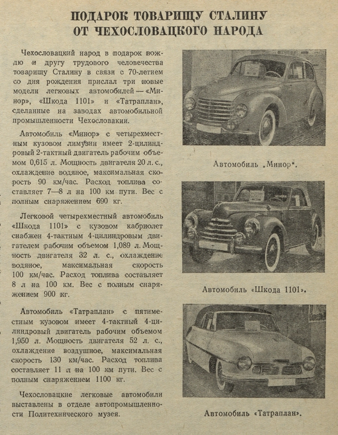 В Москве юбилейный Комитет принимает подарки и распределяет их по выставкам – одного музея Революции уже не хватает и под экспозицию даров великому вождю и учителю отдают залы ГМИИ имени А.С.Пушкина, потеснив малых голландцев, импрессионистов, Ван Гога и Пикассо. Предметы технической тематики Комитет направляет в Политехнический музей, где 26 декабря открывается выставка «Жизнь и деятельность И.В.Сталина». Газета «Правда» от 26 декабря 1949 года сообщает: «Документы и экспонаты многих стендов показывают заботу товарища Сталина о развитии науки и техники, дают наглядное представление о достижениях советских инженеров, вдохновляемых великим учителем и вождем». Так чехословацкие машины оказались в Политехе, в отделе автопромышленности. Журнал «Автомобиль» в №2 за 1950 год посвящает им небольшую заметку.