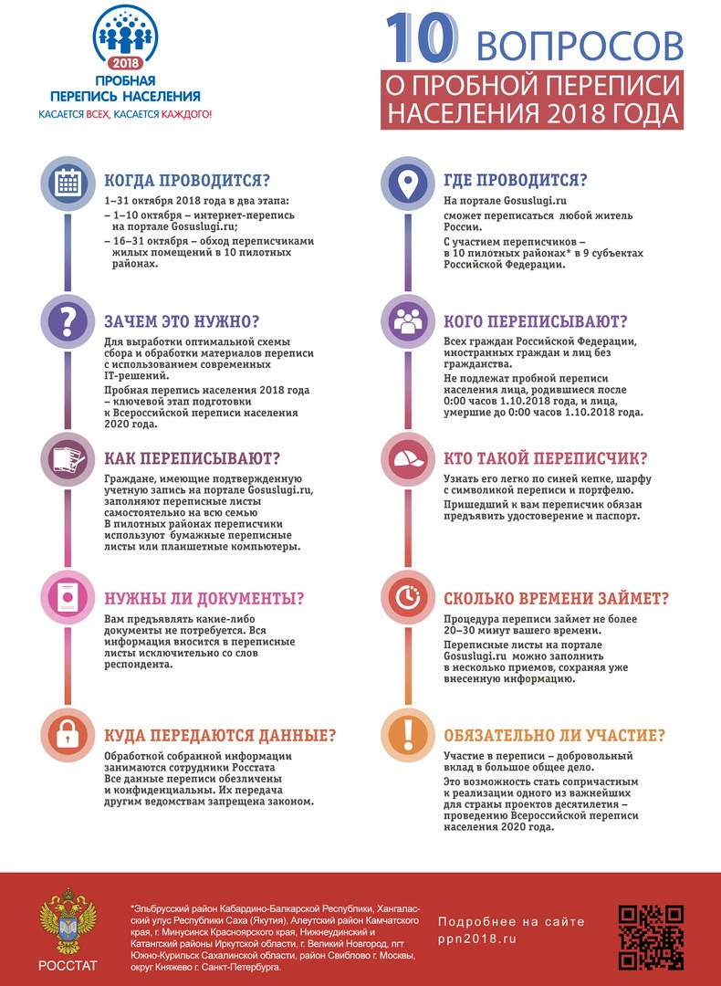 Далее, 16 октября, стартует поквартирный обход. Согласно информационной брошюре Росстата, жителям указанных территорий не потребуется предъявлять переписчикам свои документы. Все данные будут записываться непосредственно со слов населения.
