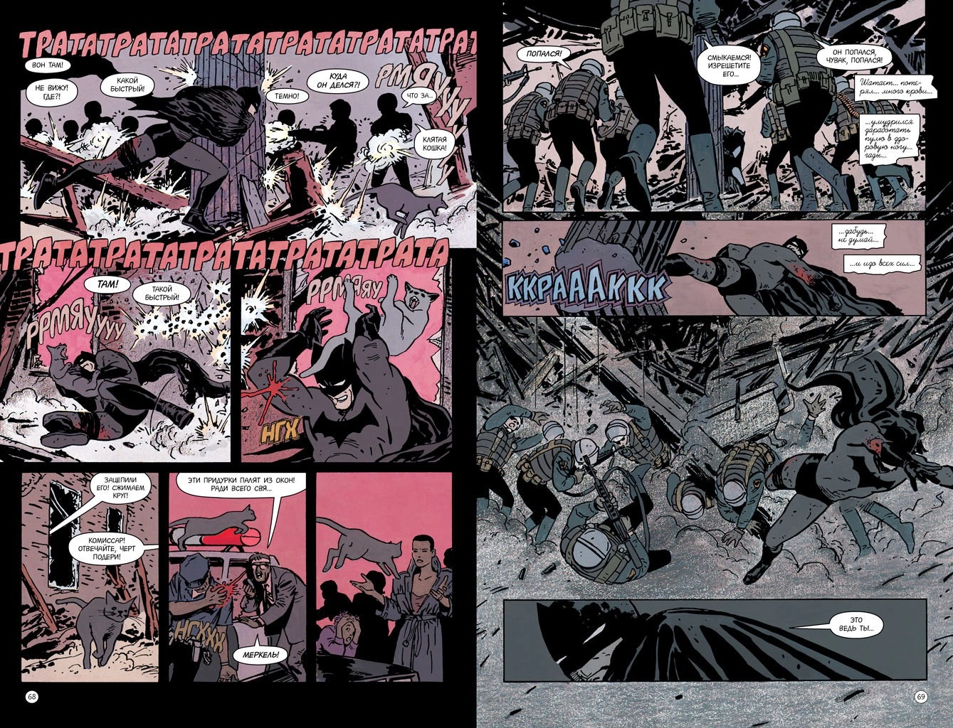 Добавим к этому, что Джеймс Гордон выступает здесь весьма бравым дядькой, который пусть и излишне переживает за беременную жену, любящую Рахманинова, но без особых проблем расправляется с «зелёным беретом» и начинает крутить интрижку с красоткой-коллегой. А Селина Кайл в первый раз появляется не просто в латексе, но ещё и с плёткой (как раз эту деталь её биографии издательству пришлось потом тщательно «замарывать»). На их фоне порой слегка блекнет сам Брюс Уэйн, то и дело канючащий об утрате контроля над ситуацией, — что, впрочем, не становится минусом, а напротив, придаёт роману дополнительной интриги.