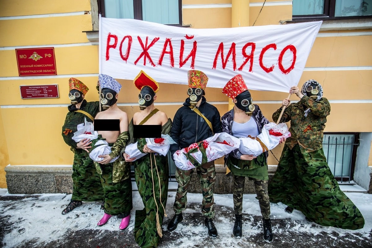 На своей странице он также опубликовал фото акции. Женщины с кокошниками на голове, в противогазах и камуфляжной одежде стоят со свертками, в которые запеленали сырое мясо. При этом участницы держат белый плакат с красной надписью «Рожай мясо».