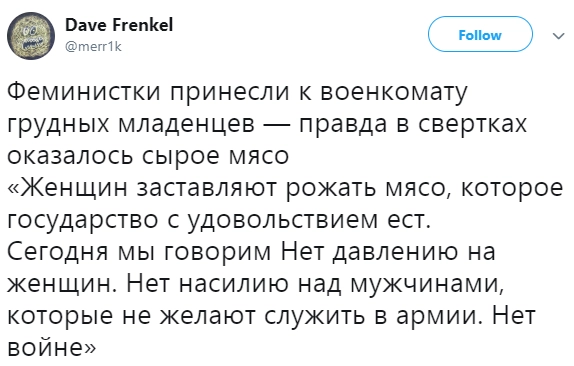 Феминистки принесли к военкомату грудных младенцев — правда в свертках оказалось сырое мясо. «Женщин заставляют рожать мясо, которое государство с удовольствием ест. Сегодня мы говорим Нет давлению на женщин. Нет насилию над мужчинами, которые не желают служить в армии. Нет войне», — написал в Twitter фотожурналист «Медиазоны» Давид Френкель.