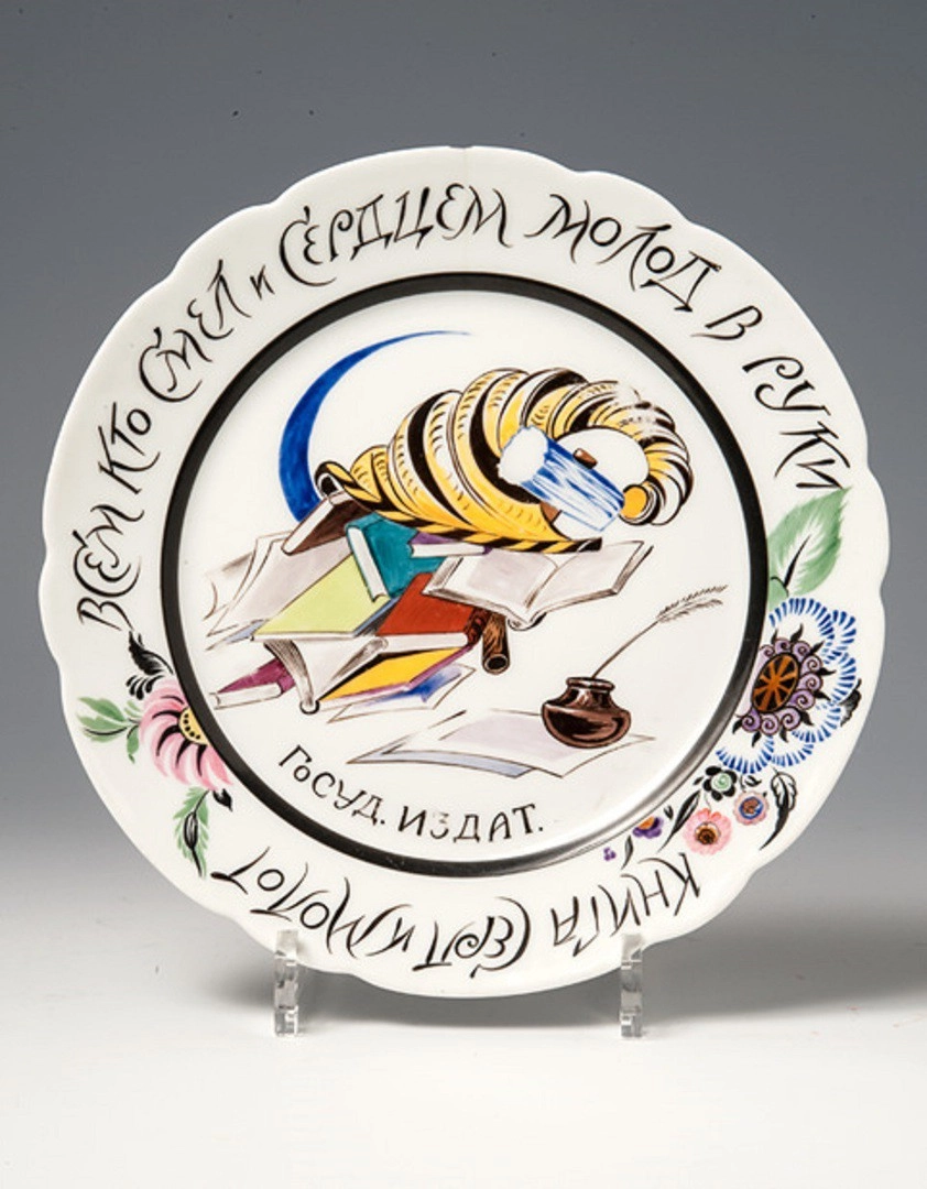 Р.Ф. Вильде. Тарелка "Всем, кто смел и сердцем молод, в руки - книга, серп и молот". Гос. фарфоровый завод, 1921. Фарфор, роспись надглазурная.