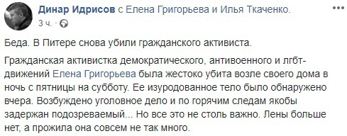 Правозащитник Динар Идрисов написал в Facebook, что Елена Григорьева была активисткой демократического, антивоенного и ЛГБТ-движений.