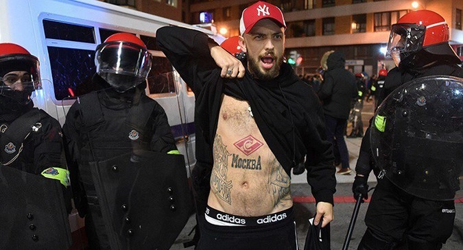 Москвичам пришлось вступить в бой практически голыми руками, однако они довольно быстро потеснили оппонентов. Ну, а когда в дело вмешалась полиция, местные полностью переключились на копов.