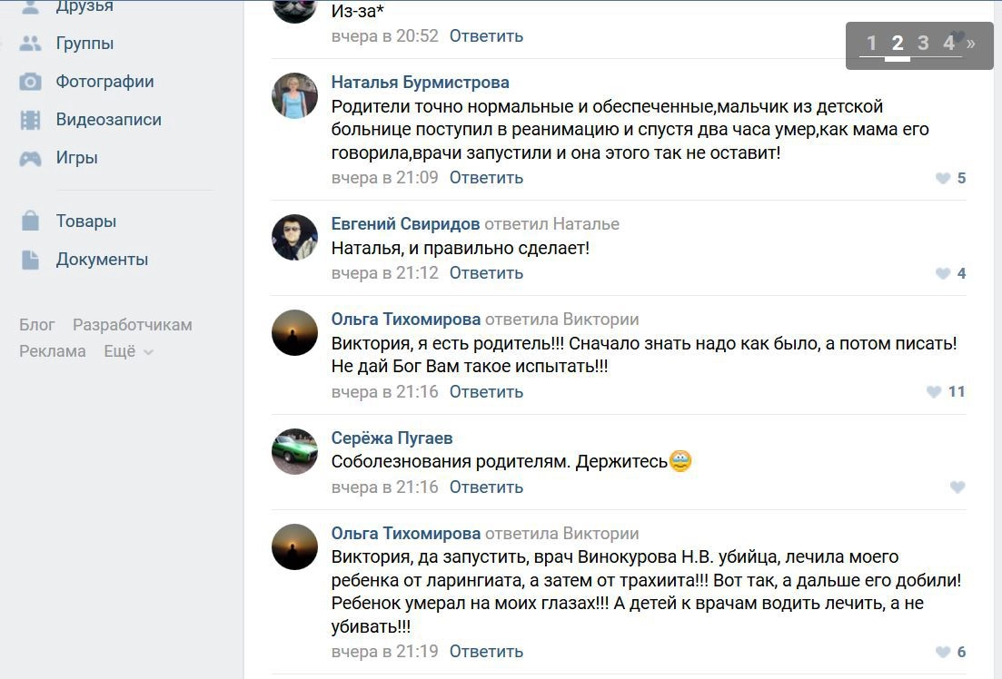 «Это мой мальчик, а у меня его забрали! Умный, добрый, отзывчивый, всегда мне помогал! Да, мы как и все родители и дети имели конфликты! Без этого ни как… Как он любим свою сестренку, как она его любила… Мы будем тебя любить все жизнь! Врач Винокурова Н. В. убийца, лечила моего ребенка от ларингита, а затем от трахеита! Вот так, а дальше его добили! Ребенок умирал на моих глазах!», — написала безутешная мать.