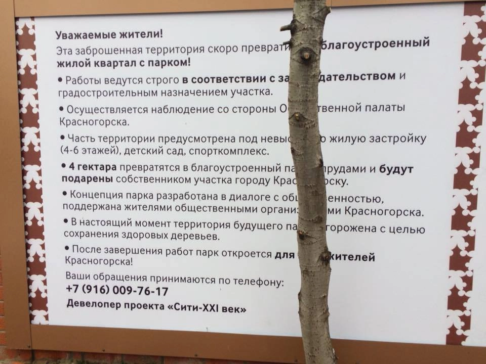 На месте парка девелоперская компания «Сити XXI век» собирается построить жилые дома, детский сад и спорткомплекс. Часть территории планируется превратить в парк с прудами и подарить Красногорску.