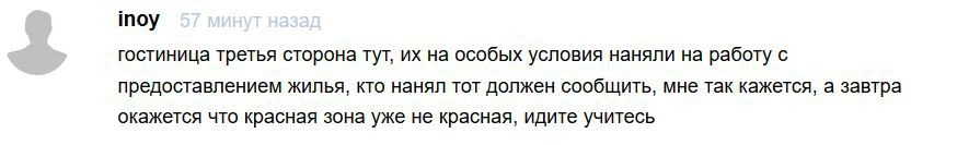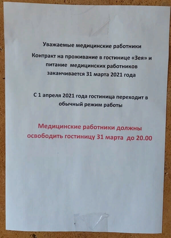 В гостинице нам объяснили, что Минздрав не продлил контракт, больше ничего конкретного не сказали. Ранее мы жили также в гостинице «Зея», потом в «Васильке», и каждый раз, когда нам сообщали о том, что меняется место жительства, сразу говорили, где мы будем проживать дальше, а сейчас тишина. Видимо, придётся решать эти вопросы самостоятельно, — цитирует «Амур.инфо» медика, работающего в «красной зоне».