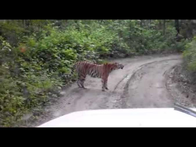 В Хасанском районе Приморского края на территории парка «Земля леопарда» местный житель записал видео с участием амурской тигрицы, которая разлеглась прямо на проезжей части дороги, проходящей по лесу, а водитель никак не мог её спугнуть с места.