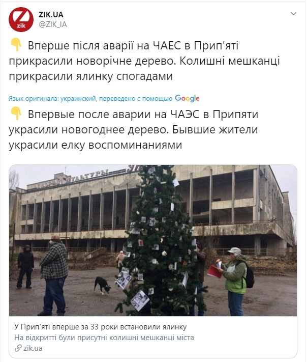 В украинском городе Припяти впервые после аварии на Чернобыльской АЭС установили новогоднюю елку. Дерево поставили возле Дворца культуры «Энергетик». Чтобы принять участие в праздничном событии, в зону отчуждения приехали бывшие жители города. Они повесили на дерево свои фотографии и новогодние игрушки. Об этом информирует украинское издание ZIK.