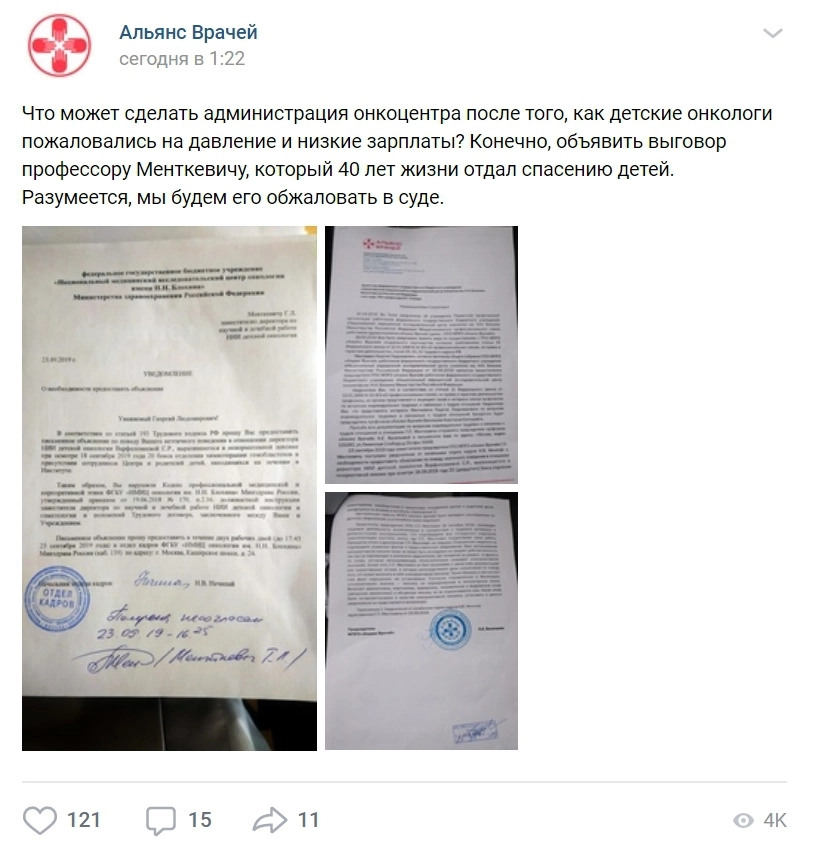 Мы призываем руководство „Альянса врачей“ проанализировать допущенные ошибки и спровоцированный ими скандал в публичном пространстве. Мы просим главу „Альянса врачей“ Анастасию Васильеву, к которой всегда прежде относились с уважением, понять, что действия ее организации сейчас наносят вред больным детям, получающим лечение в ведущем онкологическом учреждении нашей страны. Мы призываем прекратить провокации, травлю уважаемых заслуженных коллег и все публичные действия, направленные против нормальной работы онкоцентра им. Блохина.