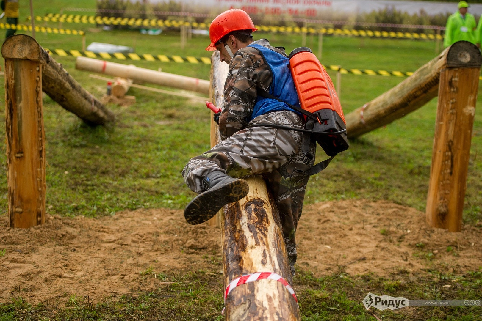 С волнением смогли справиться не все. Напрмер первый этап — заправка ранцевого огнетушителя «Ермак» пятнадцатью литрами воды сложностей не вызвал, а вот перелезть 10 наклонных бревен, да еще и скользких от начавшегося дождя, без сучка и задоринки смогли не все.