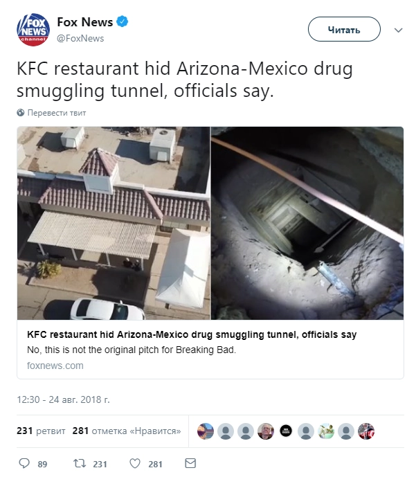 В США обнаружили подземный тоннель, ведущий из старого ресторана KFC в штате Аризона до комнаты дома в Мексике. По нему поставлялись наркотики, сообщает Би-би-си.
