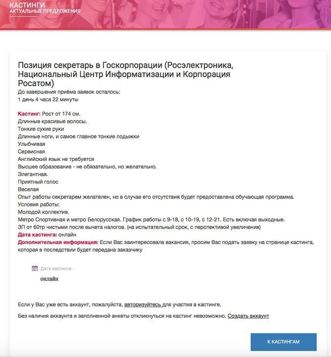 На просьбу «Ридуса» разъяснить специфические требования к работнику в кастинг-агентстве ответили, что их выдвигают заказчики, «мы же не себе подбираем».
