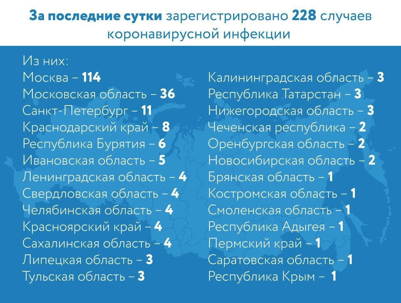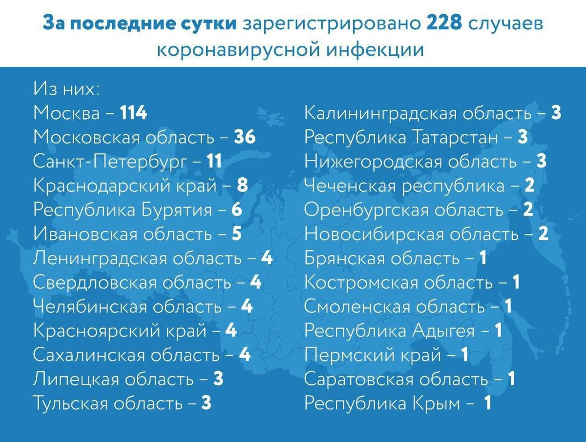 За последние сутки зафиксировано 228 новых случаев заболевания в 26 регионах, из них половина — 114 случаев — в Москве.