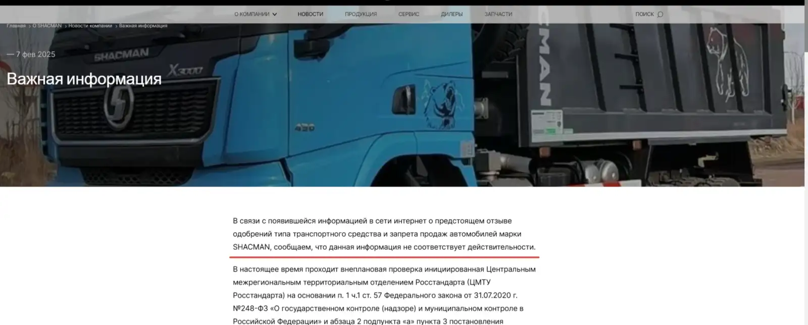 При этом в настоящее время в отношении Shacman проходит внеплановая проверка, инициированная Центральным межрегиональным территориальным управлением Росстандарта (ЦМТУ Росстандарта) на основании Федерального закона от 31 июля 2020 года № 248-ФЗ «О государственном контроле (надзоре) и муниципальном контроле в Российской Федерации» и постановления Правительства РФ от 10 февраля 2022 года № 336 «Об особенностях организации и осуществления государственного контроля (надзора), муниципального контроля».