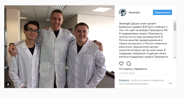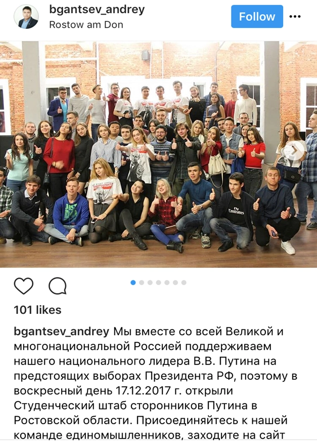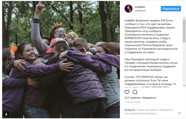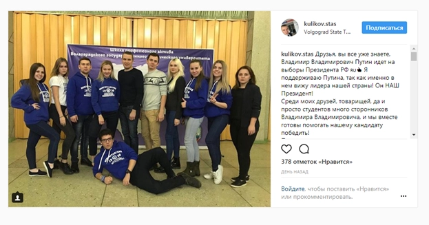 «Друзья, вы все уже знаете, Владимир Владимирович Путин идет на выборы Президента РФ. Я поддерживаю Путина, так как именно в нем вижу лидера нашей страны! Он наш Президент! Среди моих друзей, товарищей, да и просто студентов, много сторонников Владимира Владимировича, и мы вместе готовы помогать нашему кандидату победить! Предлагаю всем неравнодушным студентам объединиться и совместно создать Студенческий штаб сторонников Путина!» — написал Куликов в своем фотоблоге.