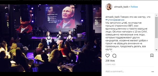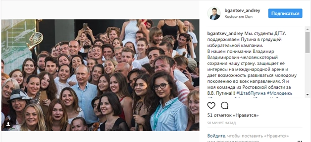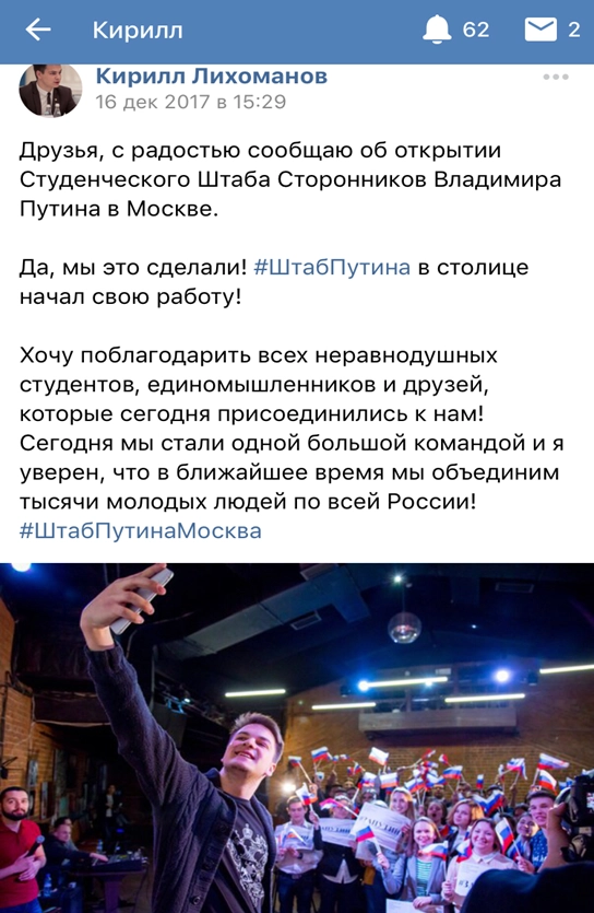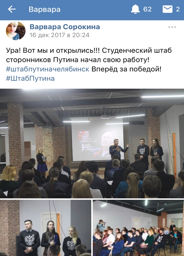 В российском сегменте социальных сетей появились сотни записей от студентов о создании штабов в поддержку Владимира Путина на президентских выборах 2018 года. Студенческие штабы выступают как агитационные пункты, а их участники публикуют в своих блогах обращения к сверстникам с хештегом #ШтабПутина, в которых предлагают объединиться для поддержки действующего президента.