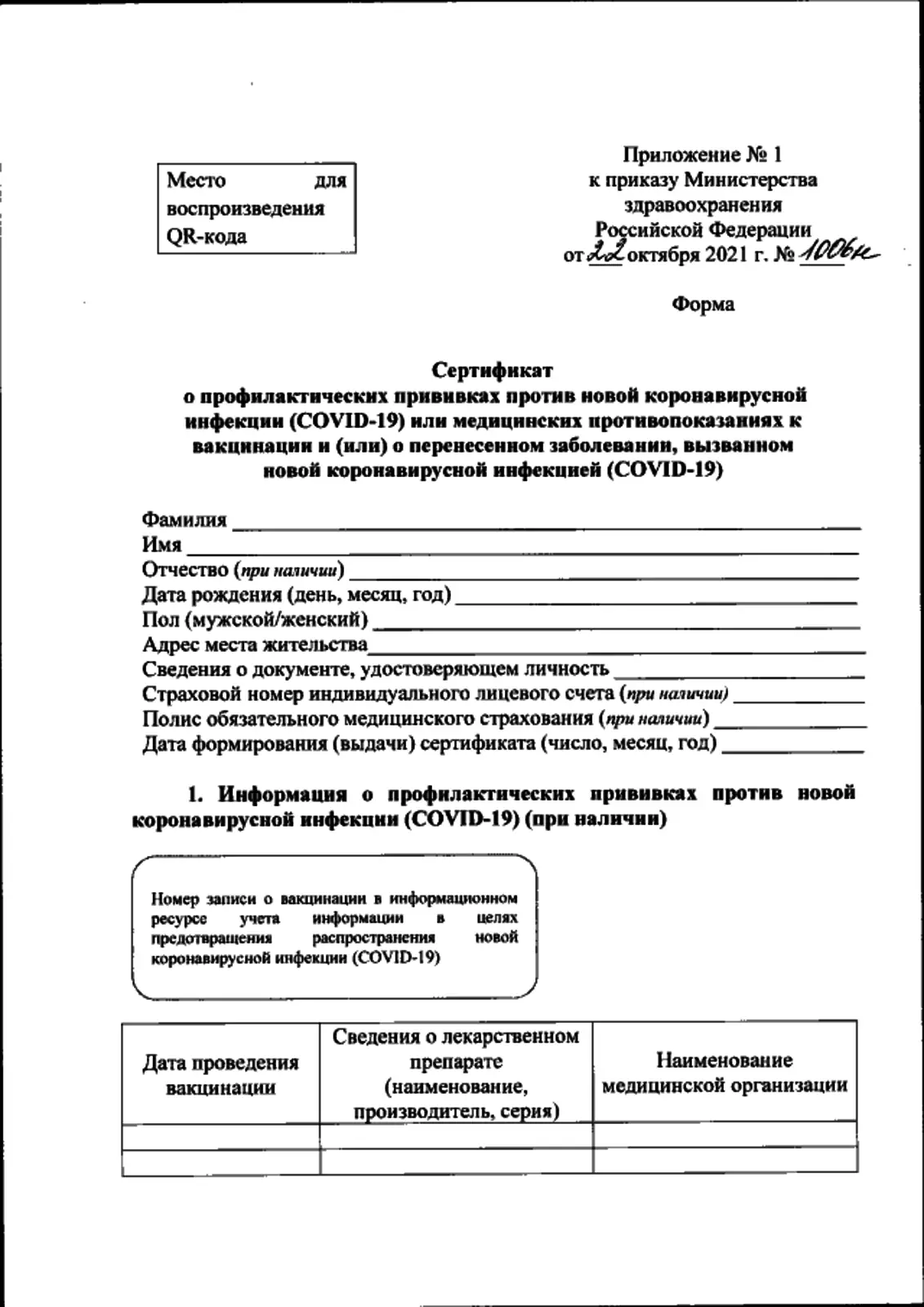 «Утвердить форму медицинской документации «Сертификат о профилактических прививках против новой коронавирусной инфекции (COVID-19) или медицинских противопоказаниях к вакцинации и (или) перенесенном заболевании, вызванном новой коронавирусной инфекцией», — говорится в тексте приказа.