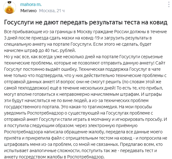 В то же время пользователи Рунета сообщают, что даже при желании опубликовать данные своих COVID-тестов на портале госуслуг не всегда могут сделать это из-за технических ошибок на сайте. Тем, кому не повезло с госуслугами, они предлагают передавать данные прямо в Роспотребнадзор, прикрепляя их к жалобе на неполадки в системе.
