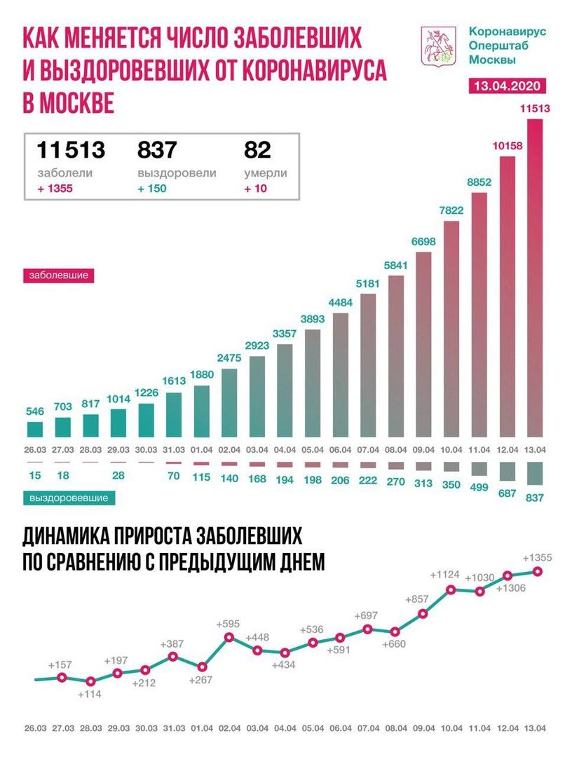 Также появились данные отдельно по Москве: за сутки выявили 1355 новых случаев коронавируса. Всего в столице к настоящему моменту зафиксировано 11 513 заболевших.