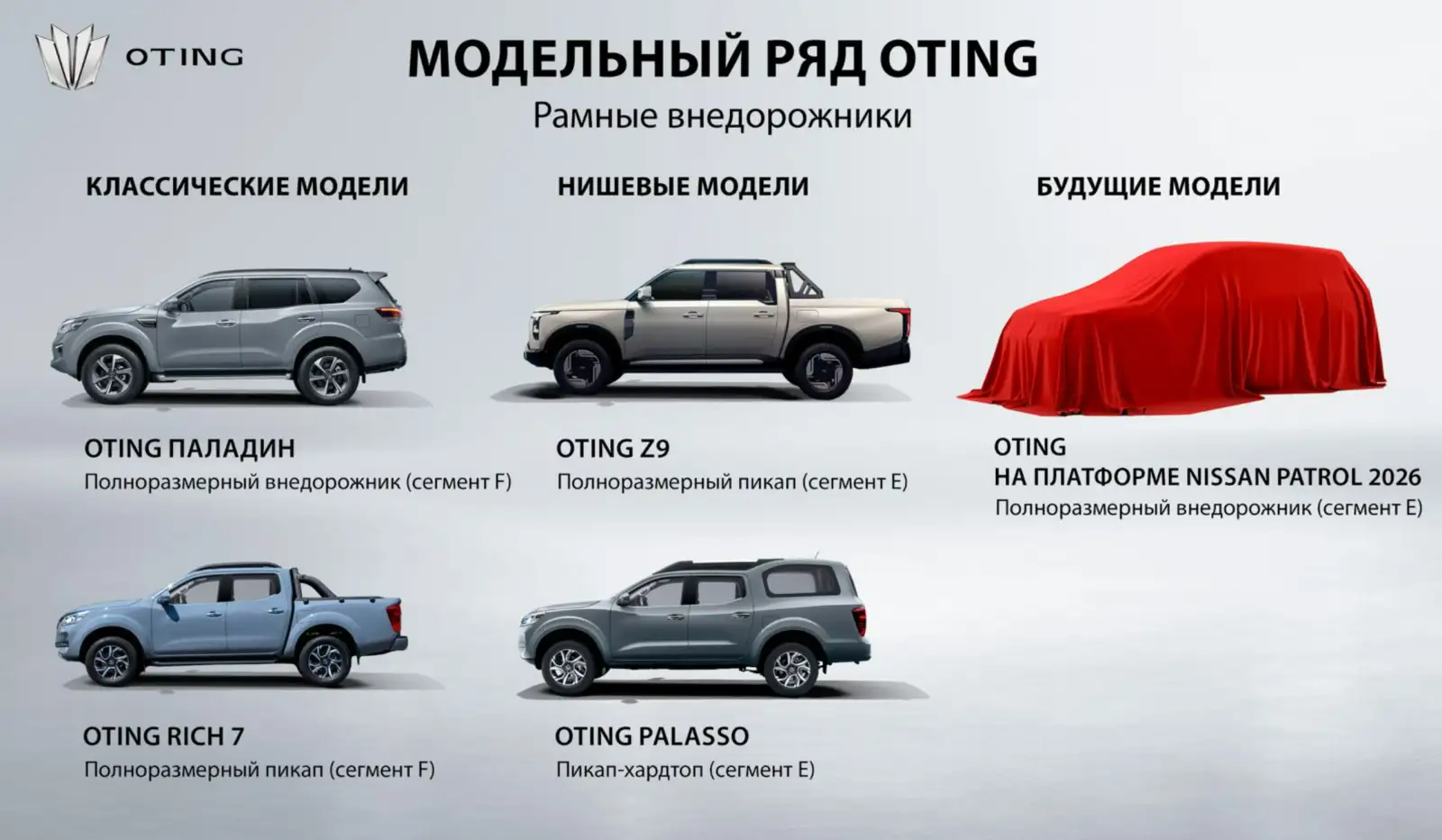 Японские автомобили, построенные на китайских заводах, пользуются в России устойчивым спросом, что не может не сказываться на предложении. Достаточно неожиданный для России рост популярности пикапов привел к тому, что Sinomach Auto заявила о выводе на рынок сразу двух новых моделей данного класса - OTING RICH 7 и OTING Z9. Сейчас машины проходят сертификацию и будут представлены в 4 квартале 2025 года. Чуть позже, в 2026 году к ним присоединится крупноразмерный внедорожник OTING на платформе знаменитого Nissan Patrol.
