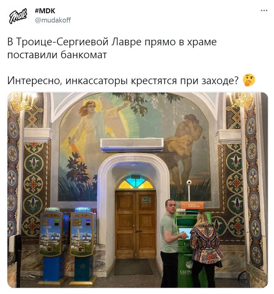 Судя по карте банкоматов на официальном сайте «Сбербанка», по указанном адресу действительно находится ближайший к Лавре банкомат, однако он расположен не в храме, а за стенами монастыря — в историческом здании Красногорских торговых рядов начала XX века, где также есть ресторан, кафе, отделение почты, цветочный и продуктовый магазины.