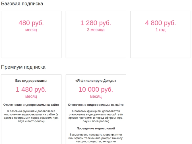 Система «a-la-carte» предоставляет абоненту возможность подключиться к телеканалу за 240 рублей в месяц — эти доходы делятся с оператором пополам. При этом стоимость обычной месячной подписки на «оптимистичный» составляет вдвое больше — 480 рублей. За «премиум-подписку» на месяц пользователю придется расстаться со внушительным количеством «кровных» — за 1480 рублей заботливый «Дождь» отключит всю рекламу на своем сайте. К слову, с этой задачей прекрасно справляется каждое второе бесплатное расширение для браузера.