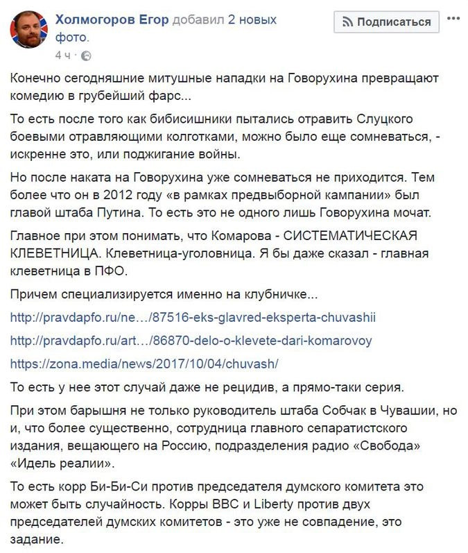 «После того как бибисишники пытались отравить Слуцкого боевыми отравляющими колготками, можно было еще сомневаться — искренне это или поджигание войны. Но после наката на Говорухина уже сомневаться не приходится. Главное при этом понимать, что Комарова — систематическая клеветница. Клеветница-уголовница», — написал публицист Егор Холмогоров.