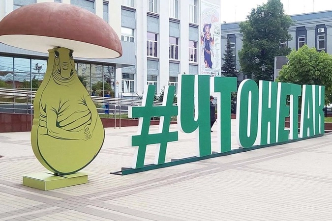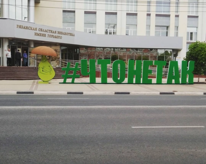 У здания рязанской библиотеки им. Горького возникла масштабная арт-инсталляция: удивленных горожан встречал народный мем «Ждун» с грибной шляпкой — рядом с огромными буквами «#Чтонетак».