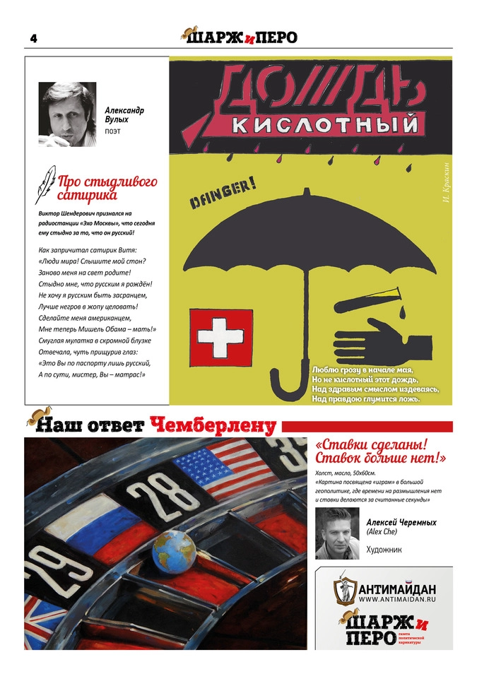 Второй номер газеты «ШАРЖ и ПЕРО», ставшей своеобразным ответом скандально известному изданию «Charlie Hebdo», как и дебютный, наполнен политическими карикатурами и сатирическими стихами. Среди авторов второго выпуска «ШАРЖ и ПЕРО» известные европейские и российские художники-карикатуристы и поэты.