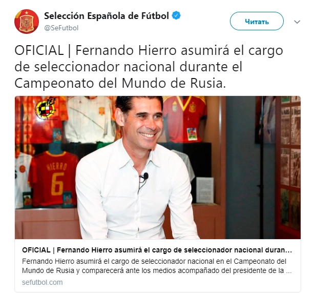 Уволенного 13 мая с поста главного тренера сборной Испании по футболу Хулена Лопетеги сменил бывший капитан мадридского «Реала» Фернандо Йерро, до этого исполнявший обязанности спортивного директора национальной команды. Сообщение о назначении нового тренера было опубликовано на странице сборной в Twitter.