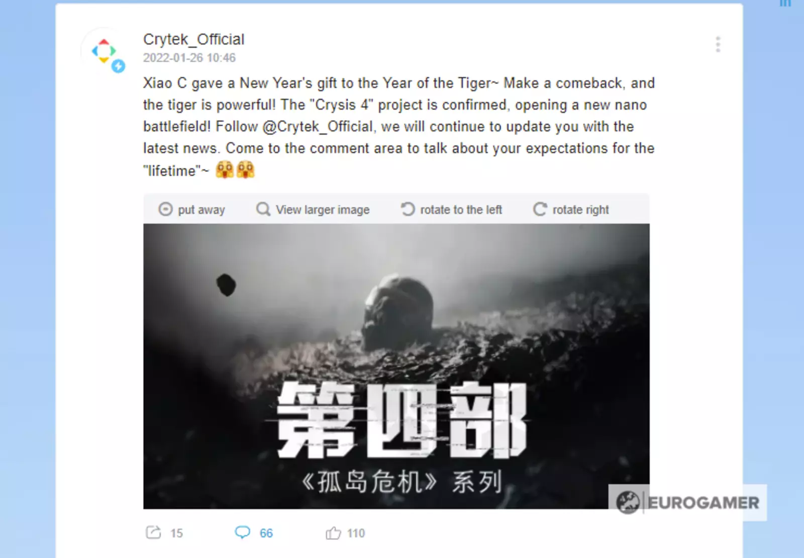 Изображение, которое сегодня появилось на китайском сайте, говорит о том, что проект Crysis-4 официально подтвержден. Далее команда обещает извещать обо всех важных новостях в ближайшее время.