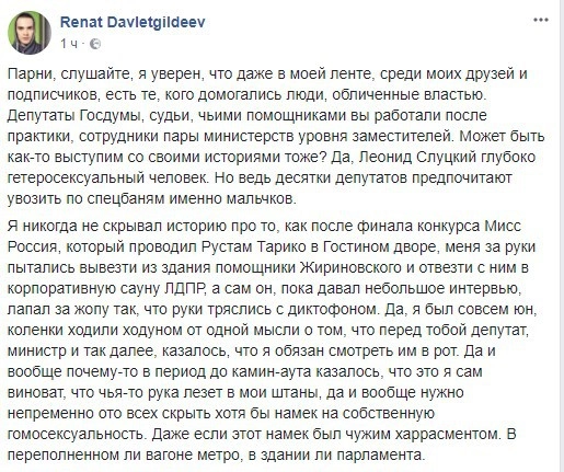 Журналист издания «Настоящее время», открытый гей Ренат Давлетгильдеев обвинил лидера ЛДПР Владимира Жириновского в сексуальных домогательствах. Об этом он написал на своей странице в Facebook.