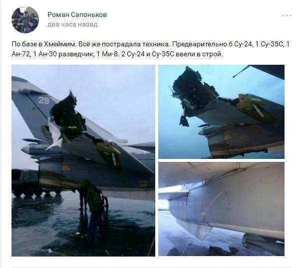 Военный журналист Роман Сапоньков опубликовал в соцсети «ВКонтакте» фотографии российских самолетов, поврежденных при атаке на авиабазу в Хмеймим. По его словам, повреждения получили шесть фронтовых бомбардировщиков Су-24, истребитель Су-35С, транспортный Ан-72, разведывательный Ан-30 и вертолет Ми-8. Журналист добавил, что три самолета возвращены в строй. Судьба остальных неизвестна.