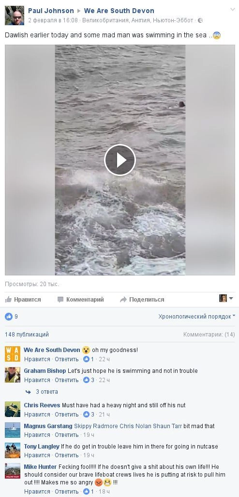 «Долиш ранний сегодня, и какой-то сумасшедший плавает в море», — написал автор видео Пол Джонсон на своей странице в Facebook.