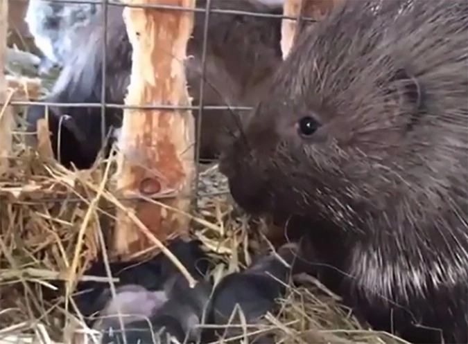В Сети появилось видео самки дикобраза, взявшей под опеку крольчат