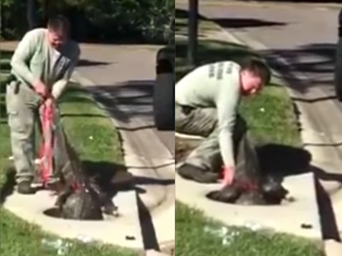В Сети появилось видео спасения застрявшего в люке аллигатора