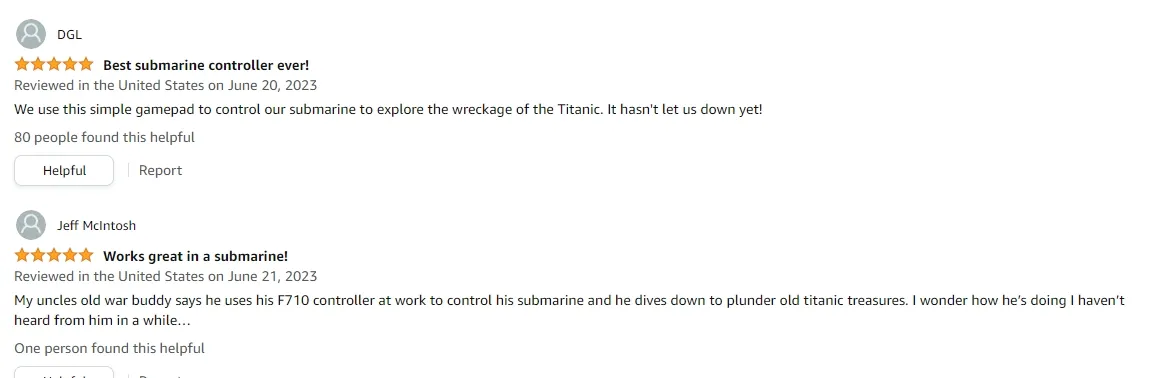 Любопытно, что после катастрофы «Титана» в Сети стали появляться издевательские отзывы на Logitech F710, в которых его описывают как «лучший контроллер для управления подводной лодкой».