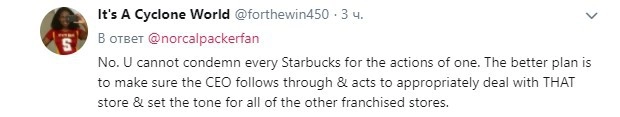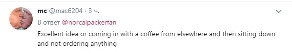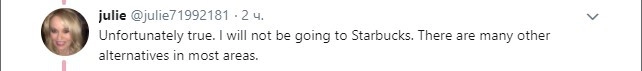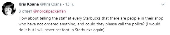 «Я не пойду в Starbucks. В большинстве районов есть много других альтернатив», «Отличная идея приходить с кофе из других мест, а затем садиться и ничего не заказывать», «Как насчет того, чтобы сообщать сотрудникам каждого Starbucks, что в их магазине есть люди, которые ничего не заказали, и предлагать им позвонить в полицию?» — написали пользователи в Twitter.