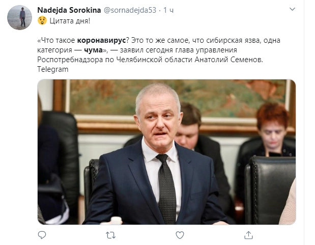 Глава управления Роспотребнадзора Челябинской области Анатолий Семенов сравнил коронавирус с сибирской язвой. Такое заявление эксперт сделал после совещания у губернатора Алексея Текслера, сообщает издание URA.RU.