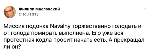«Ой, тут Васисуалий Лоханкин-Навальный голодовку собирается прекращать. Как последняя дешевка, Леша решил прикрыться гражданскими врачами: „Только по просьбе общественности прекращаю, а то бы уморил себя!“ Достал нож — бей. Решил голодать — голодай до победного. Иначе не мужик, а балабол и актер-истерик. Надутая пустота, а не политик. Всё у него фальшивое», — высказался юрист Илья Ремесло.