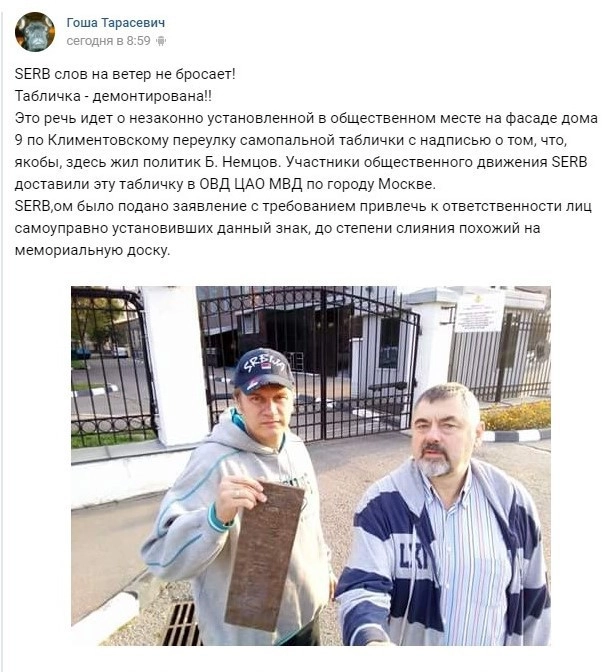 «SERB слов на ветер не бросает! Табличка — демонтирована!!» — написали активисты движения на своей страничке в соцсети «ВКонтакте».