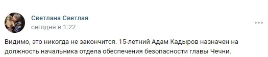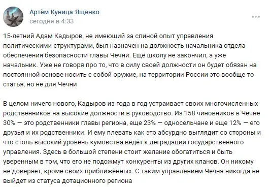 Министр Чечни по национальной политике Ахмед Дудаев сообщил, что 15-летний сын Рамзана Кадырова, который ранее избил заключенного в СИЗО, получил «важную должность» в службе безопасности главы Чеченской республики.